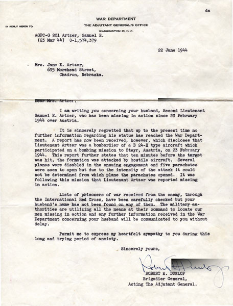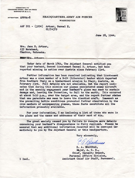 2nd Lt. Samuel Elwood Artzer Bombardier 721st Squadron, 450th Bombardment Group
