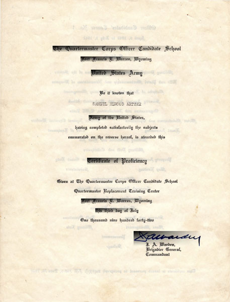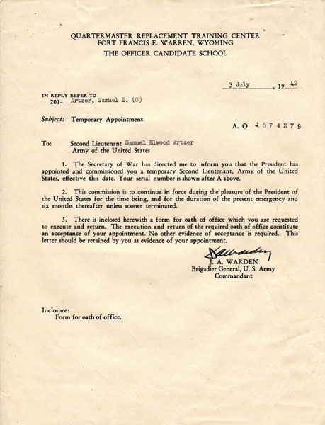 sent to OCS at Ft. Francis E. Warren, Cheyenne, Wyoming. On July 2, 1942, he