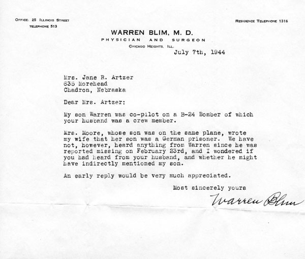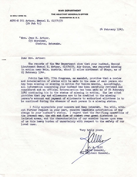 Above documents provided by James Linn, grandson of 2nd Lt. Artzer